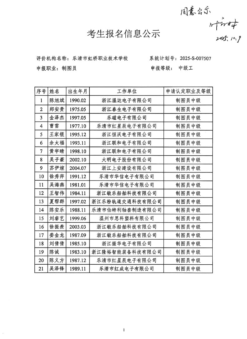 乐清市虹桥职业技术学校10月份制图员中级考生报名信息公示