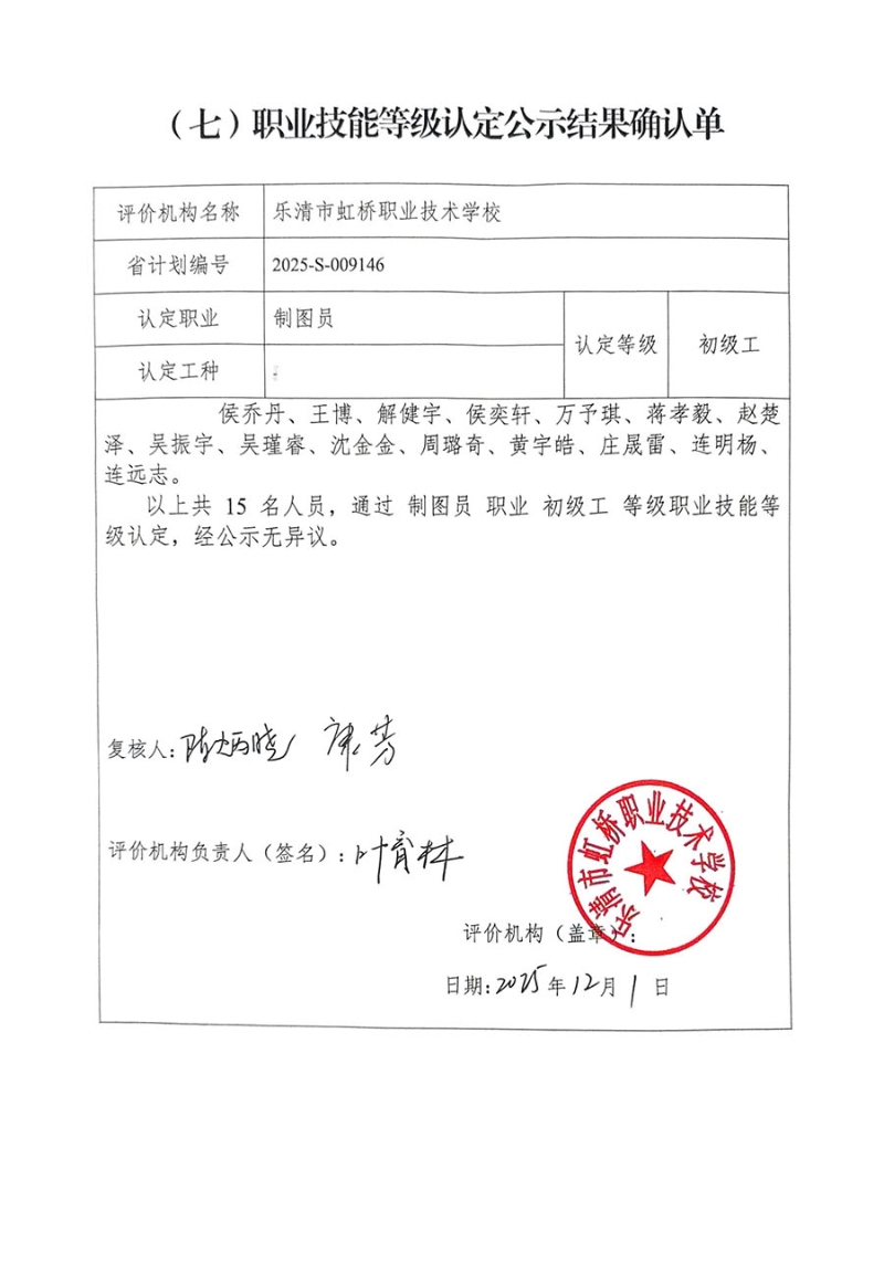 乐清市虹桥职业技术学校11月份制图员初级合格名单公示